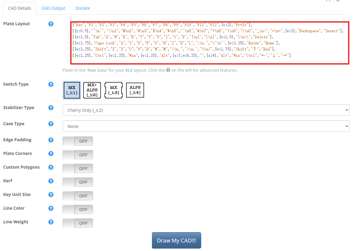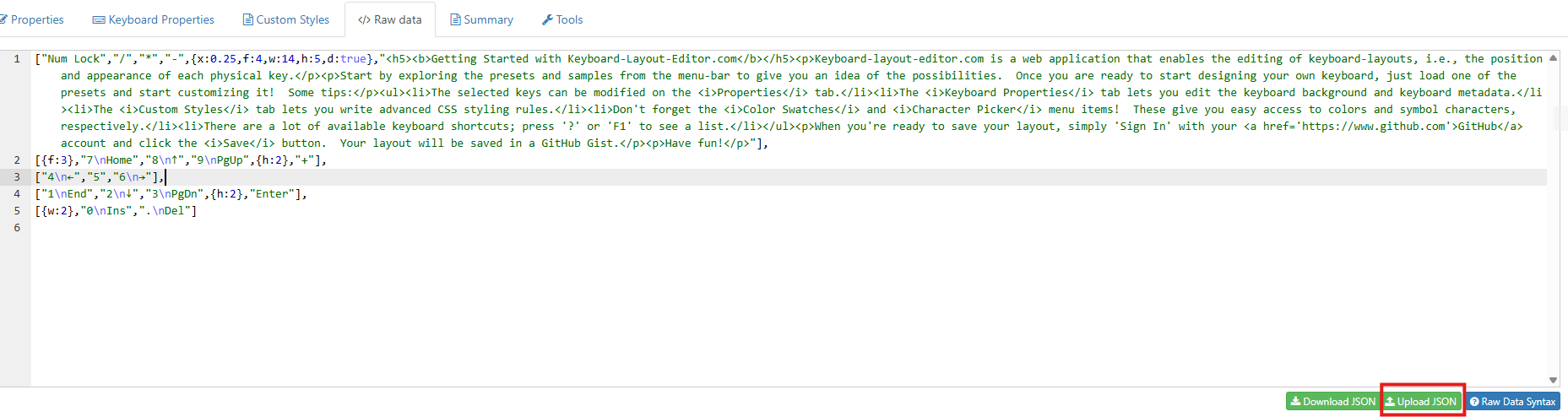 首先回到https://www.keyboard-layout-editor.com/网站,打开在下方的Raw data栏