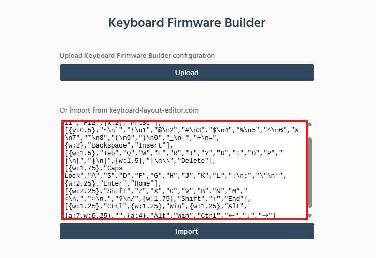 打开https://kbfirmware.com/网站,在红框处把复制的内容粘贴上去,点击下方的Import,网站会自动为我们生成配列。