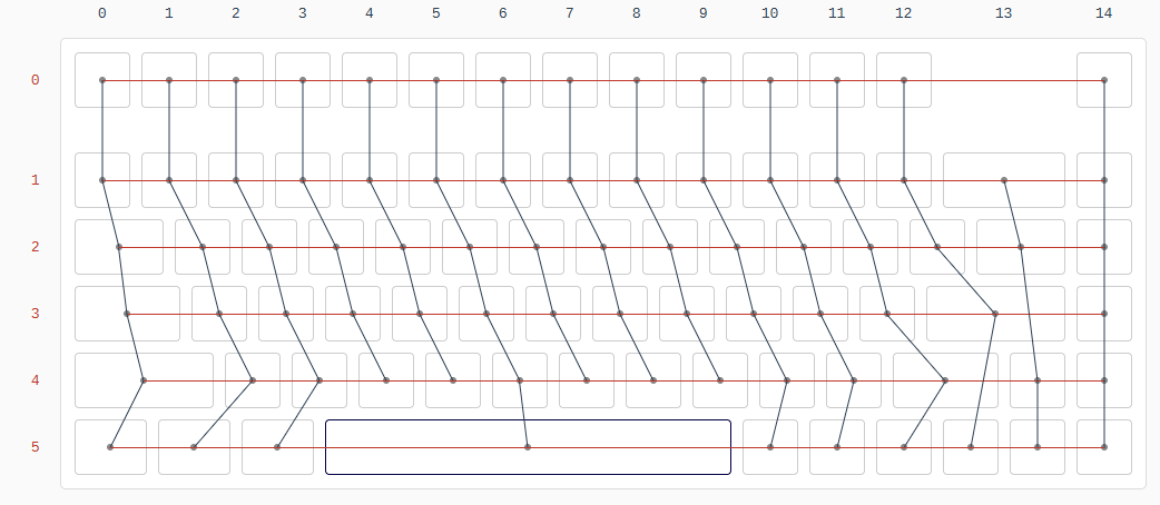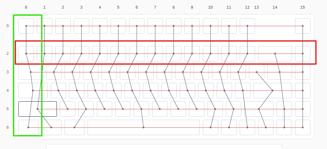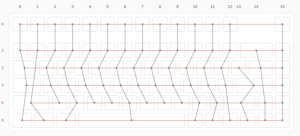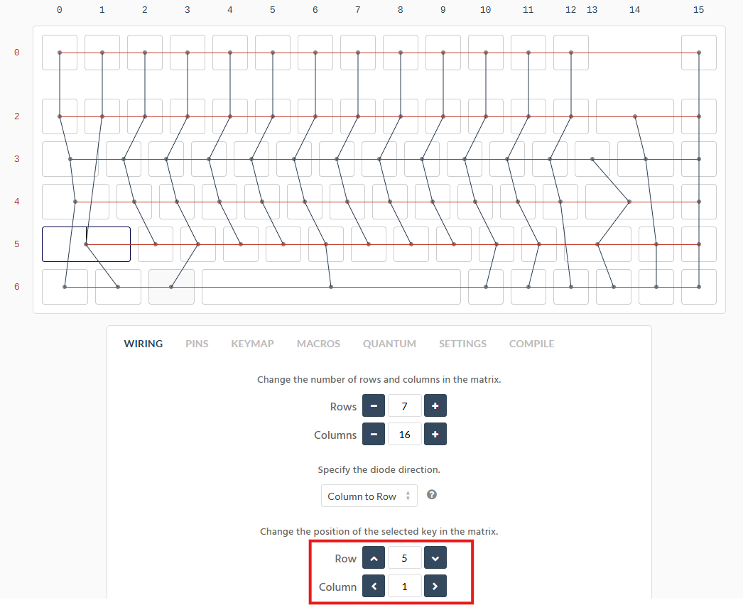 生成的配列的最大行号是6,最大列号是是15,也就是说需要7行16列,实际上我们设计的键盘有6行15列,所以,我们要手动修改下配列。